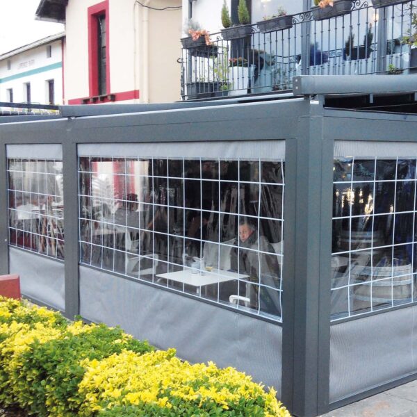 Este modelo puede fabricarse con o sin ventana transparente, e incluso con un perfil intermedio para reforzar la estructura en instalaciones de mayor tamaño. Es compatible con tejidos como acrílicos, PVC opaco o PVC cristal, y se adapta perfectamente tanto a espacios residenciales como de hostelería.