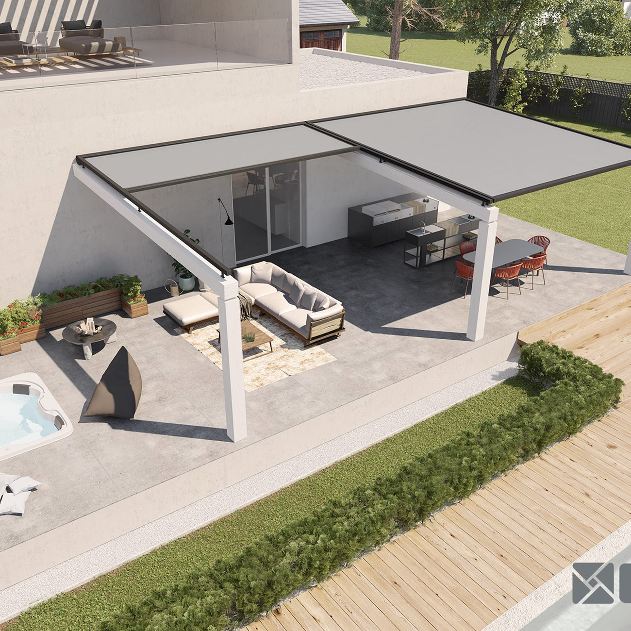 El modelo Sirio es una estructura corredera de diseño plano y minimalista, pensada para cubrir espacios exteriores como patios, jardines, terrazas o zonas chill out. Fabricado en aluminio resistente, permite configuraciones con techo fijo o móvil, deslizante manualmente sobre guías con rodamientos de alta calidad. Su diseño plano facilita la integración en arquitectura contemporánea, y está disponible con perfiles reforzados de hasta 125×125 mm, adaptándose a dimensiones amplias. Admite tejidos técnicos como PVC opaco, microperforado o acrílicos, y está disponible en una amplia gama de acabados.