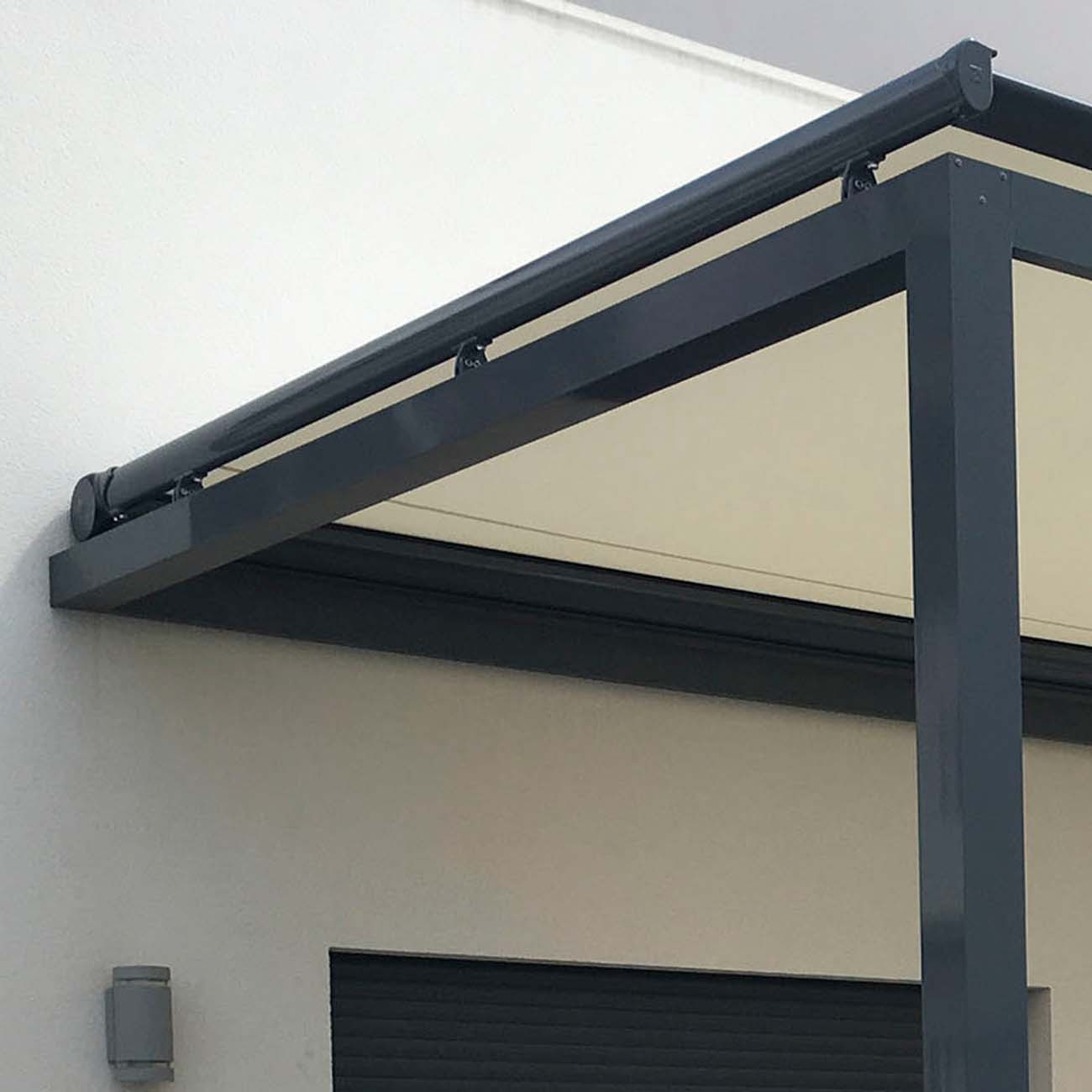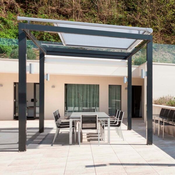 El modelo Veranda Giotto es un sistema diseñado específicamente para cubrir techos de vidrio, lucernarios, pérgolas o estructuras fijas, ofreciendo una protección solar eficaz y elegante. Su diseño permite el desplazamiento horizontal o inclinado de la lona, manteniéndola siempre tensada gracias a un sistema de guías y tensores ocultos.
